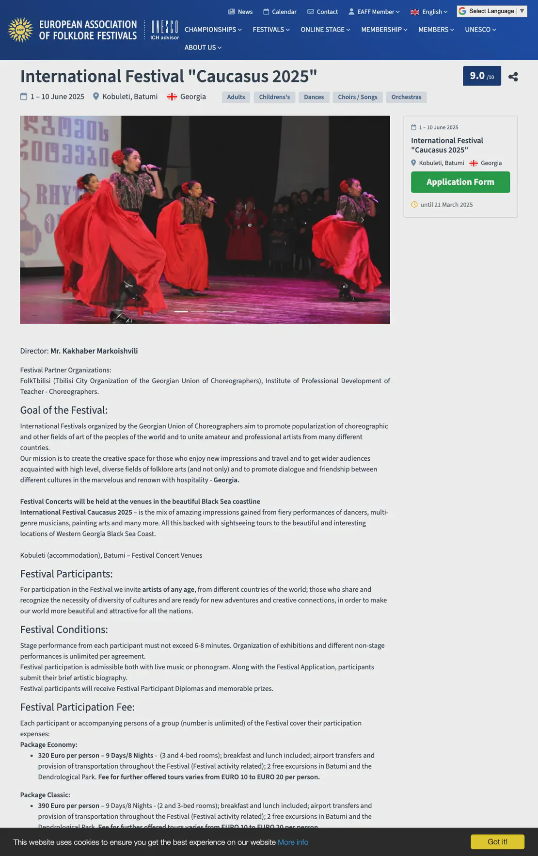 A festival in Tbilisi showcasing international folk dance and music, with performances highlighting traditional Georgian instruments like the chiboni.