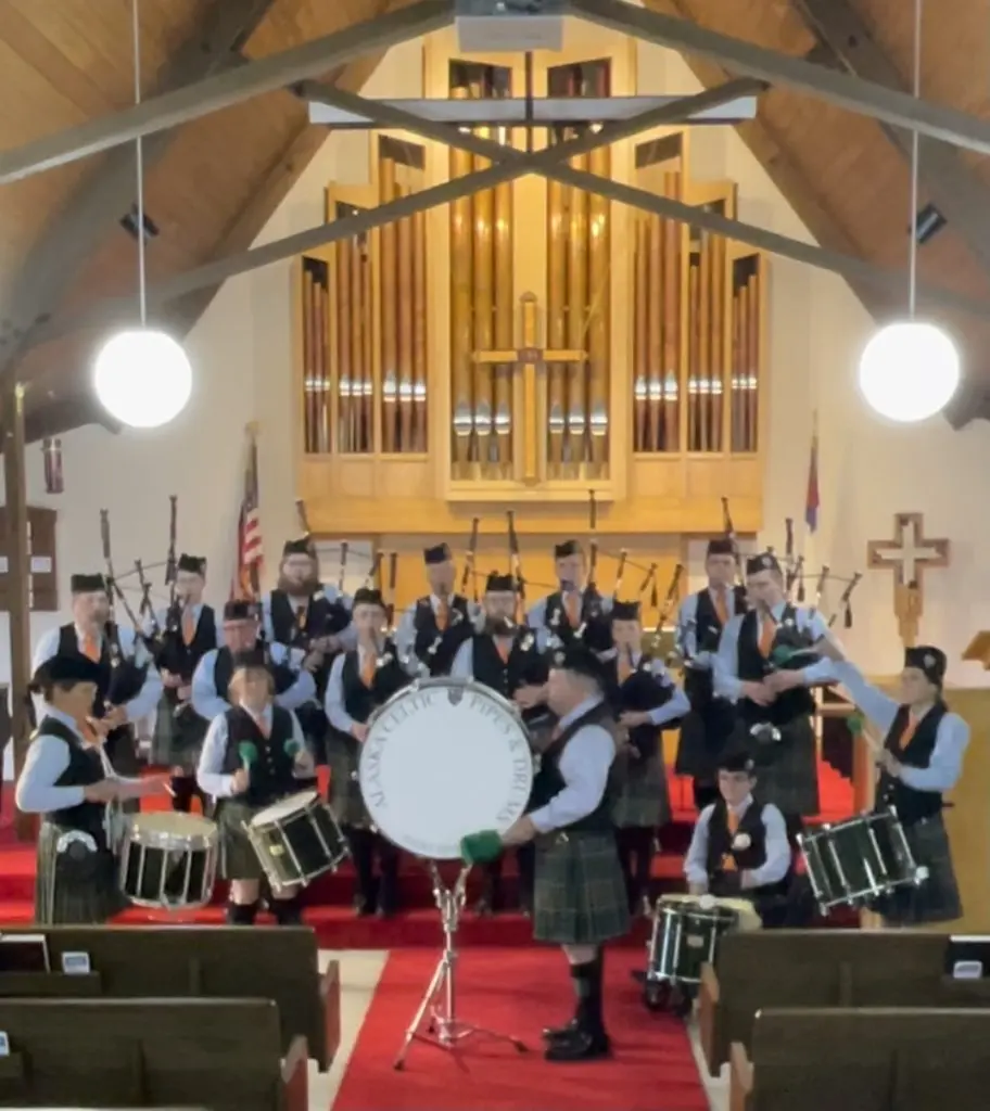 Initially going by the name Chugach Irish Pipes & Drums, the founding members of the Band began meeting in May of 2005, and soon formally changed the Band’s name to Alaska Celtic Pipes & Drums. Alaska Celtic Pipes & Drums have since performed, amongst other events, at the Alaska Scottish Highland Games, the Pacific Northwest Highland Games, the Anchorage Folk Festival, the Willow Winter Carnival, the Chugiak 4th of July parade, the Eagle River Bear Paw Festival parade, the Palmer Colony Days parade, Soldotna Emergency Services’ 9/11 Ceremonies, the Last Frontier Honor Flight events, the Cancer Society’s Relay for Life, school events, graduations, funerals, weddings, as well as other area festivals, Highland Games, and Pipe Band Competitions. We also host various community concerts throughout the year. We continue these services to benefit the great state in which we live.